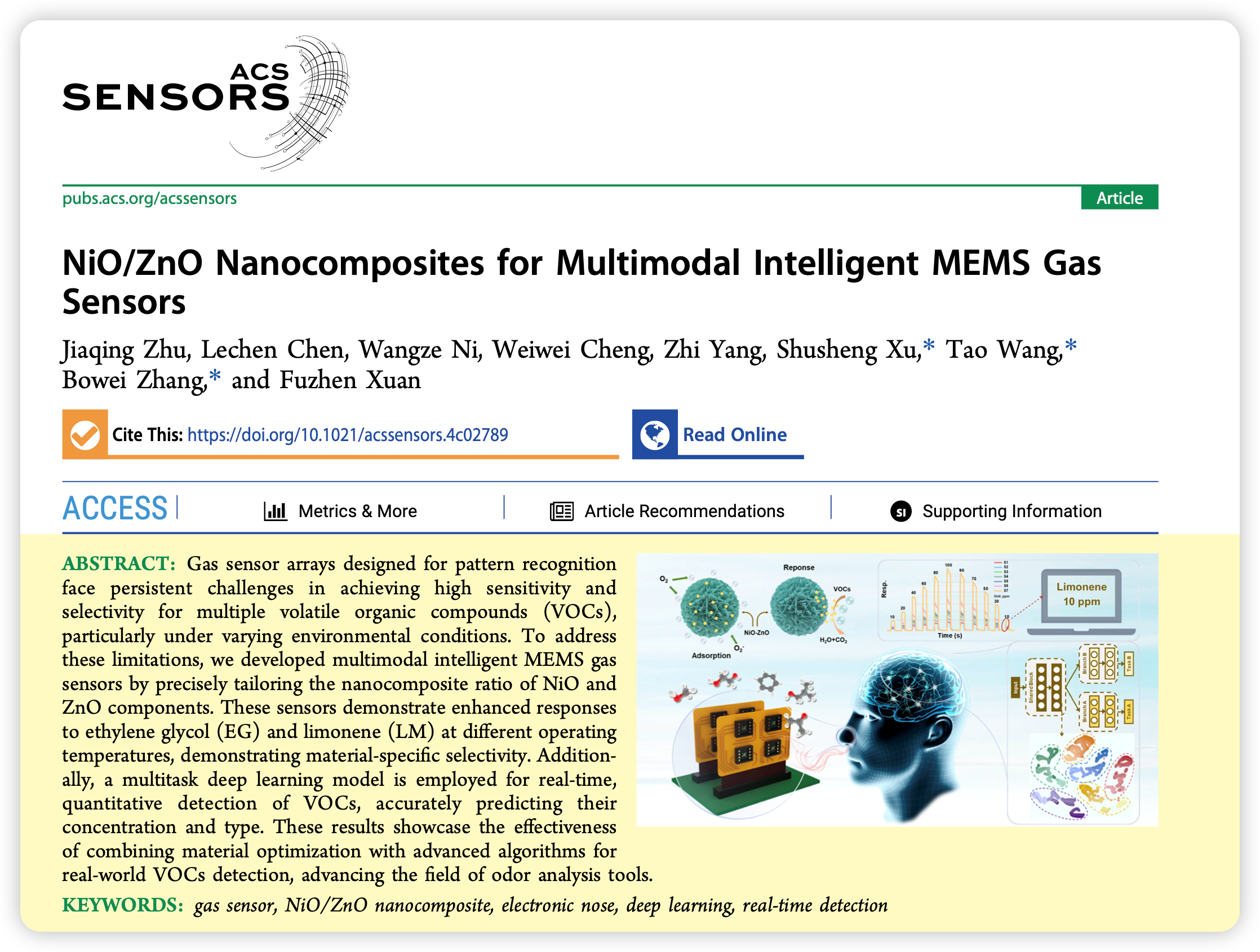 近日,太阳成集团tyc151cc徐书生博士指导硕士研究生朱佳清在传感器学科国际顶级学术期刊《ACS Sensors》(中科院一区Top,影响因子8.3)上发表了题为“NiO/ZnO Nanocomposites for Multimodal Intelligent MEMS Gas Sensors”的研究论文。徐书生为第一通讯作者,朱佳清为第一作者,华东理工大学的张博威教授和王涛副研究员为本论文的共同通讯作者。